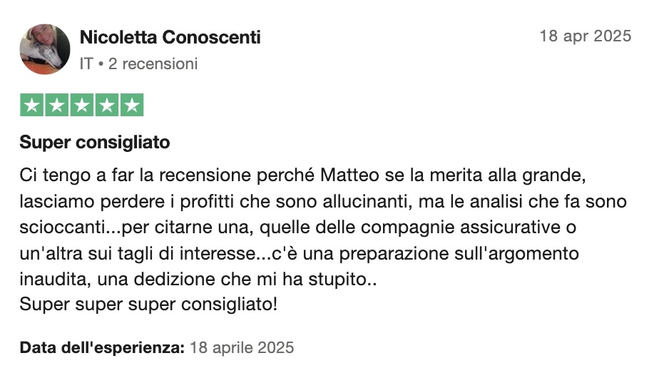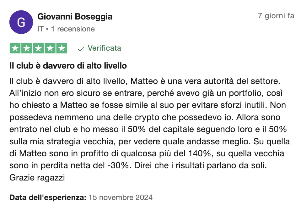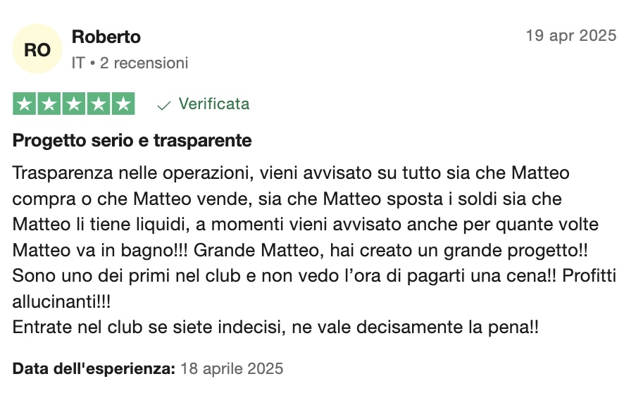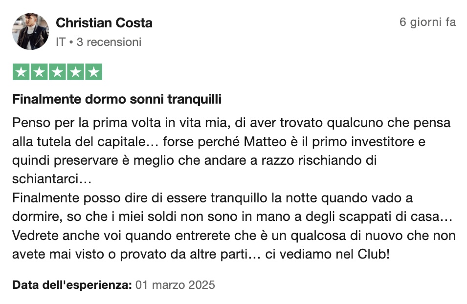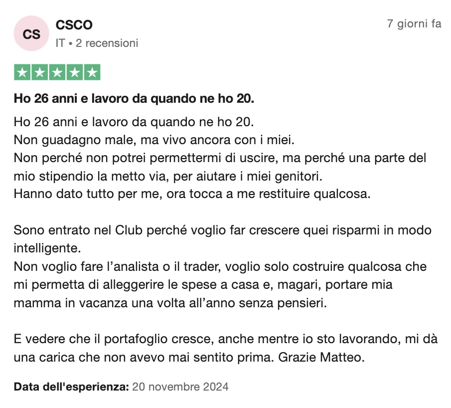 È un circolo privato dove io condivido in tempo reale i miei investimenti e le mie analisi.